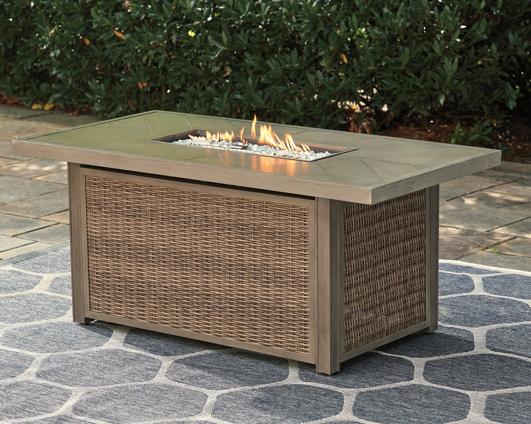 Sporting an easy-on-the-eyes look inspired by driftwood, this fire pit table elevates the art of alfresco living. Its chic chevron-patterned top is paired with all-weather resin wicker over rust-proof aluminum for beauty and brawn. A stainless steel burner with glass beads adds a captivating element sure to wow.