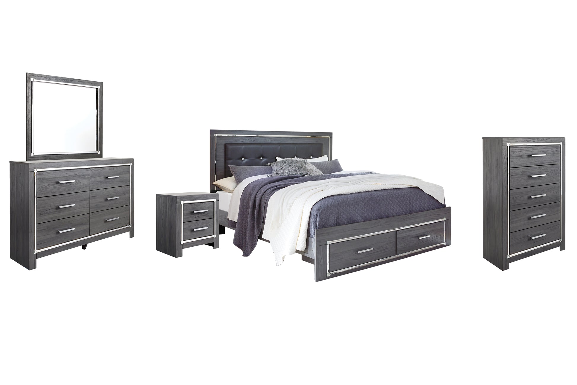 Lodanna King Panel Bed with 2 Storage Drawers with Mirrored Dresser, Chest and Nightstand
